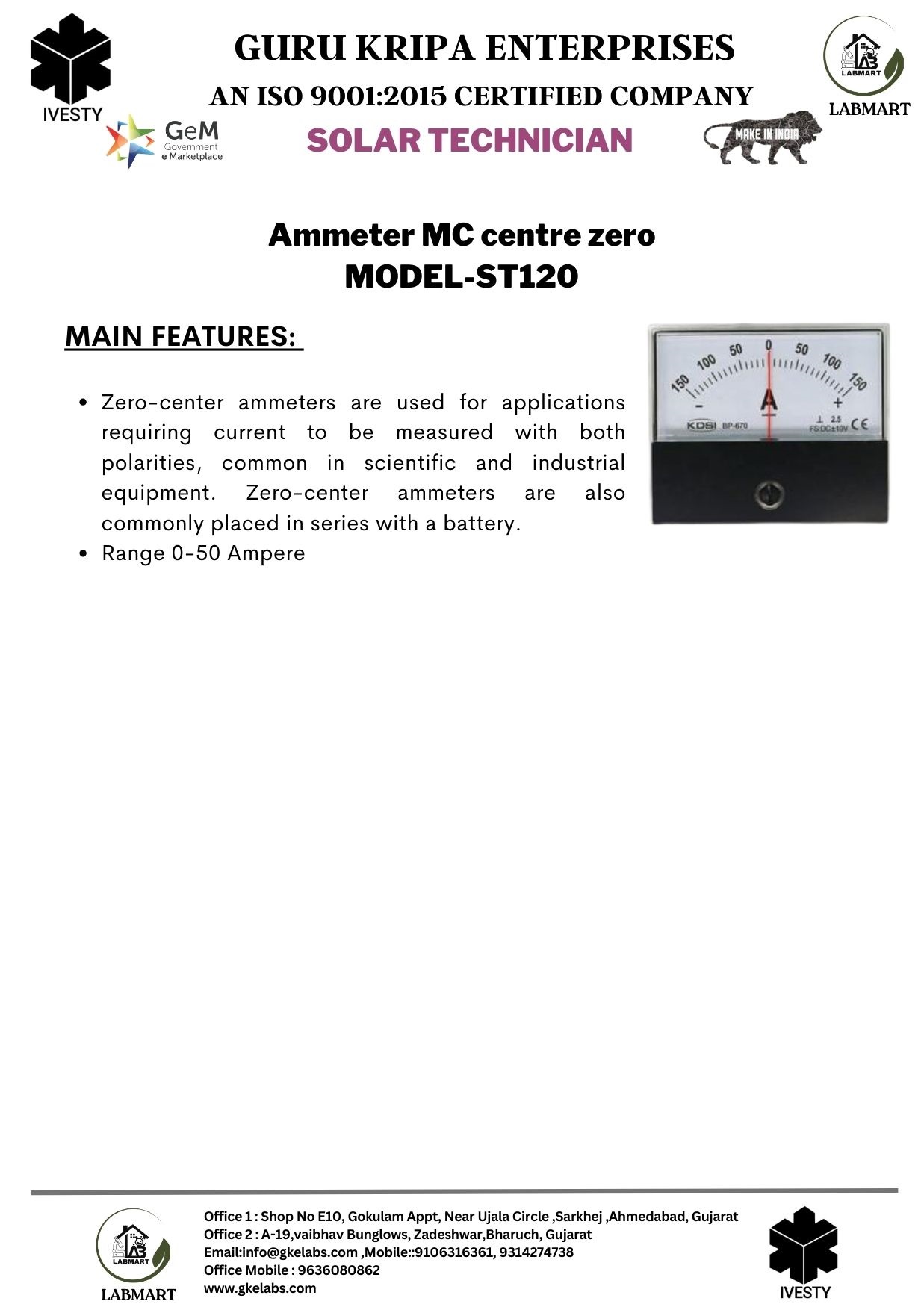 Ammeter MC centre zero MODEL-ST120