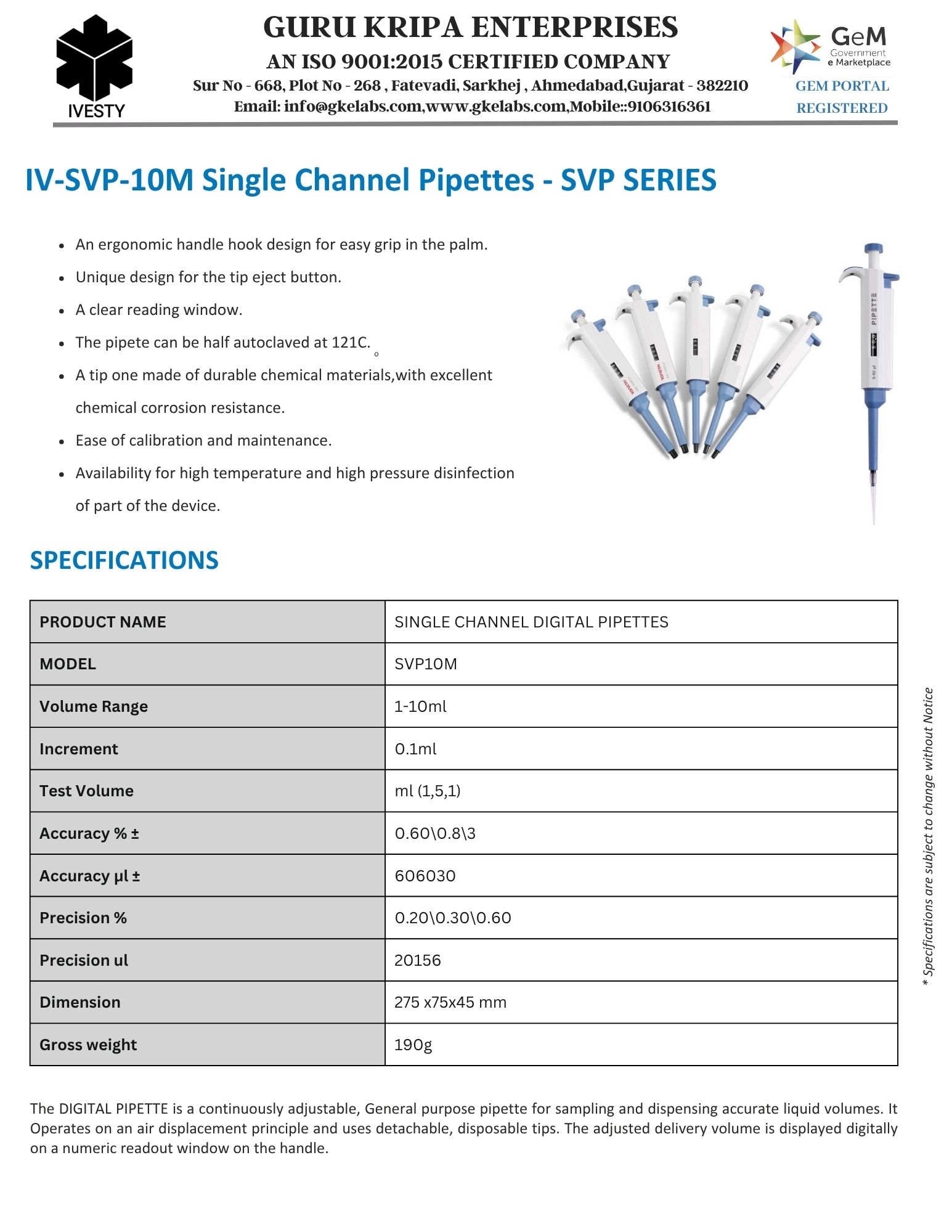 IV-SVP-10M Single Channel Pipettes - SVP SERIES
