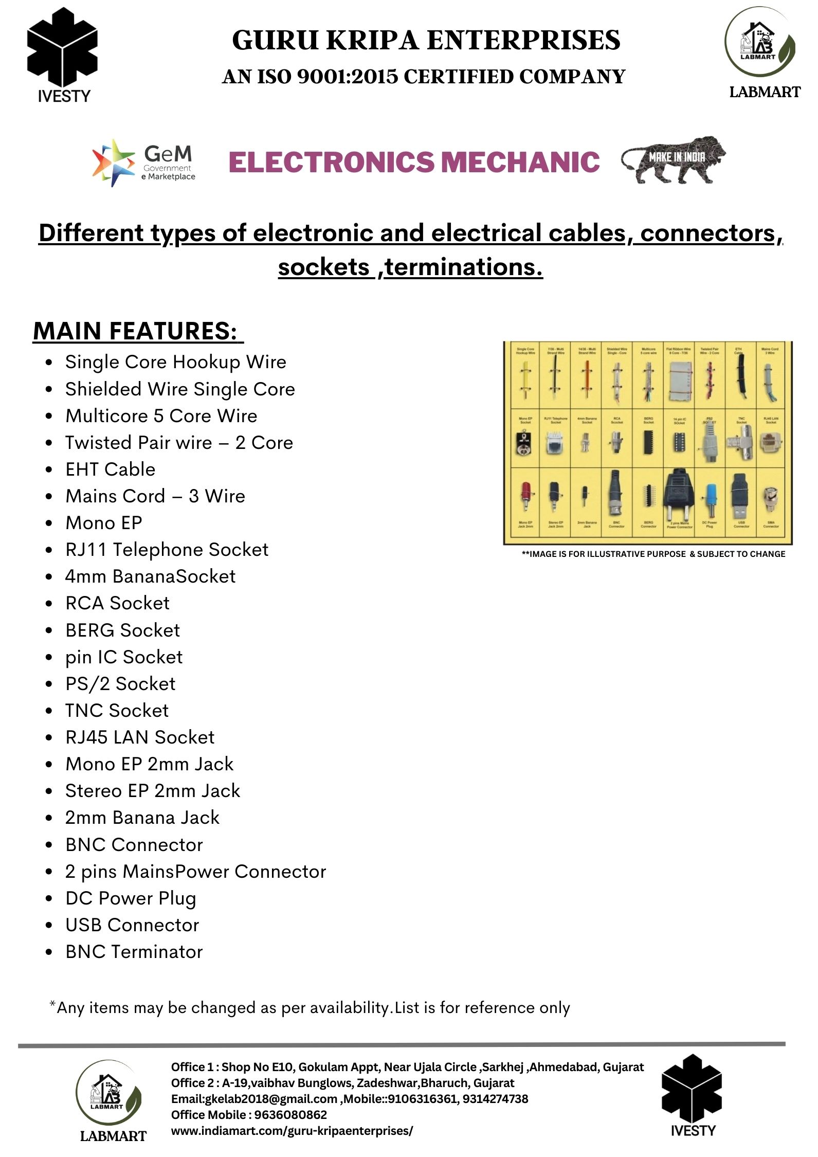 Different types of electronic and electrical cables, connectors, sockets ,terminations.