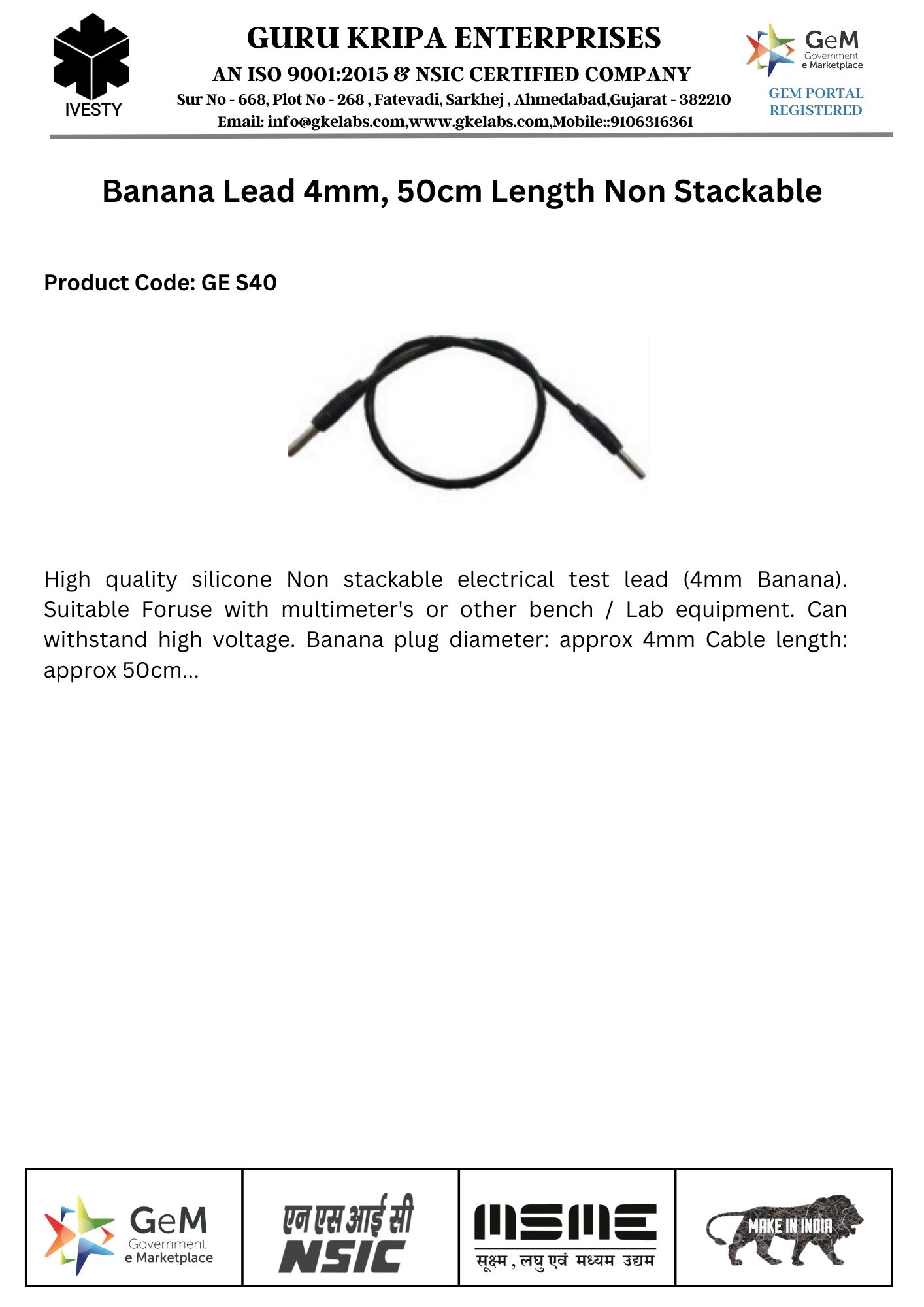 Banana Lead 4mm, 50cm Length Non Stackable
