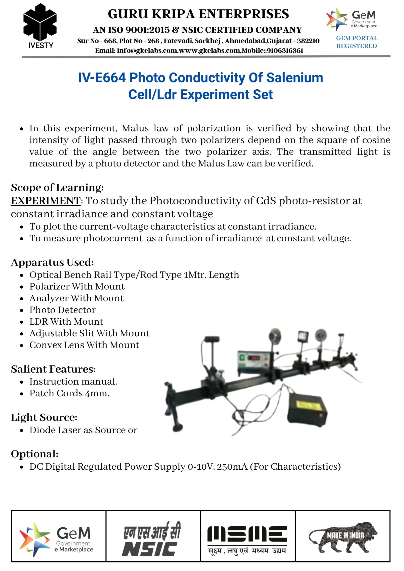 Photo Conductivity Of Salenium Cell/Ldr Experiment Set