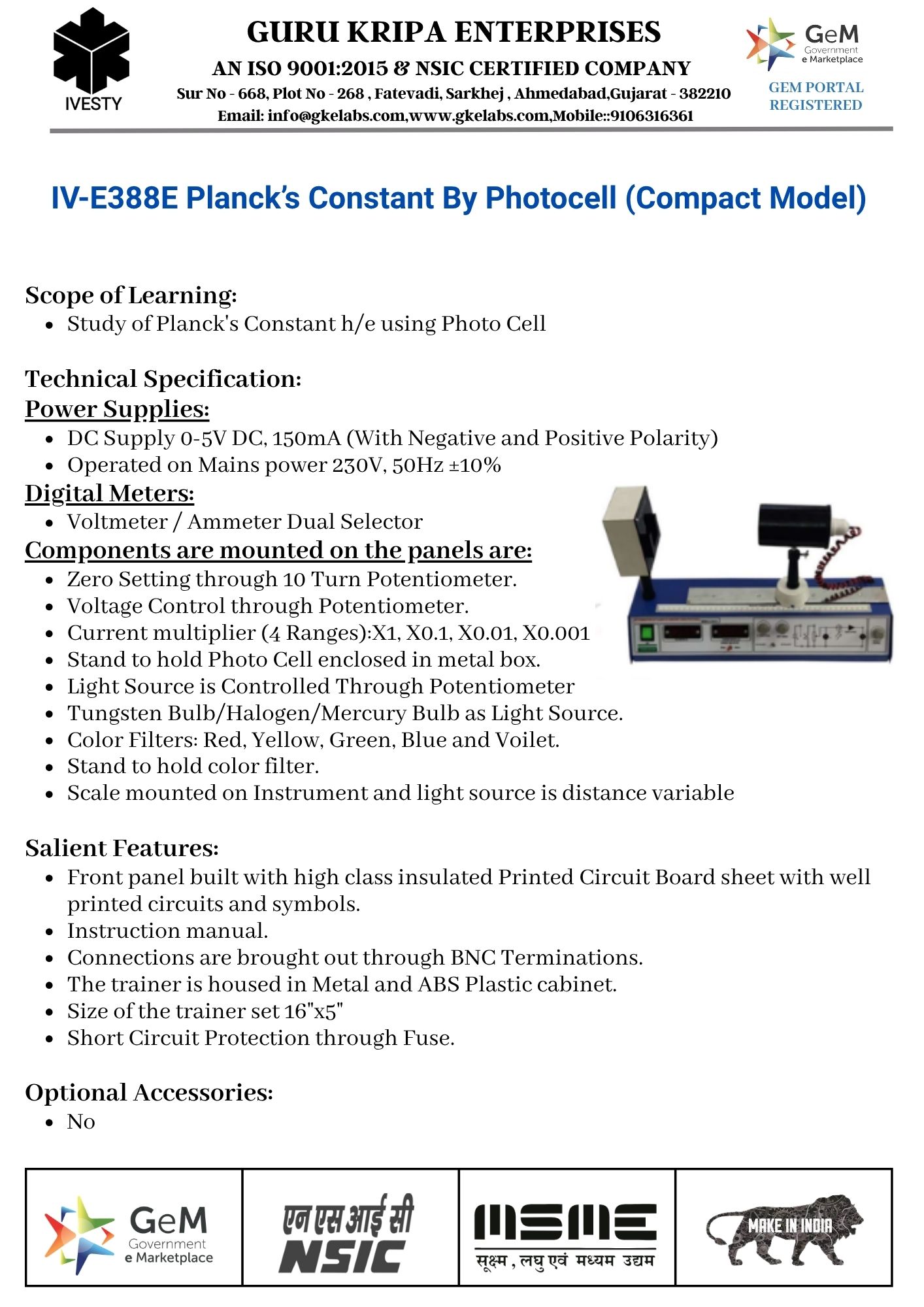 Planck’s Constant By Photocell (Compact Model)