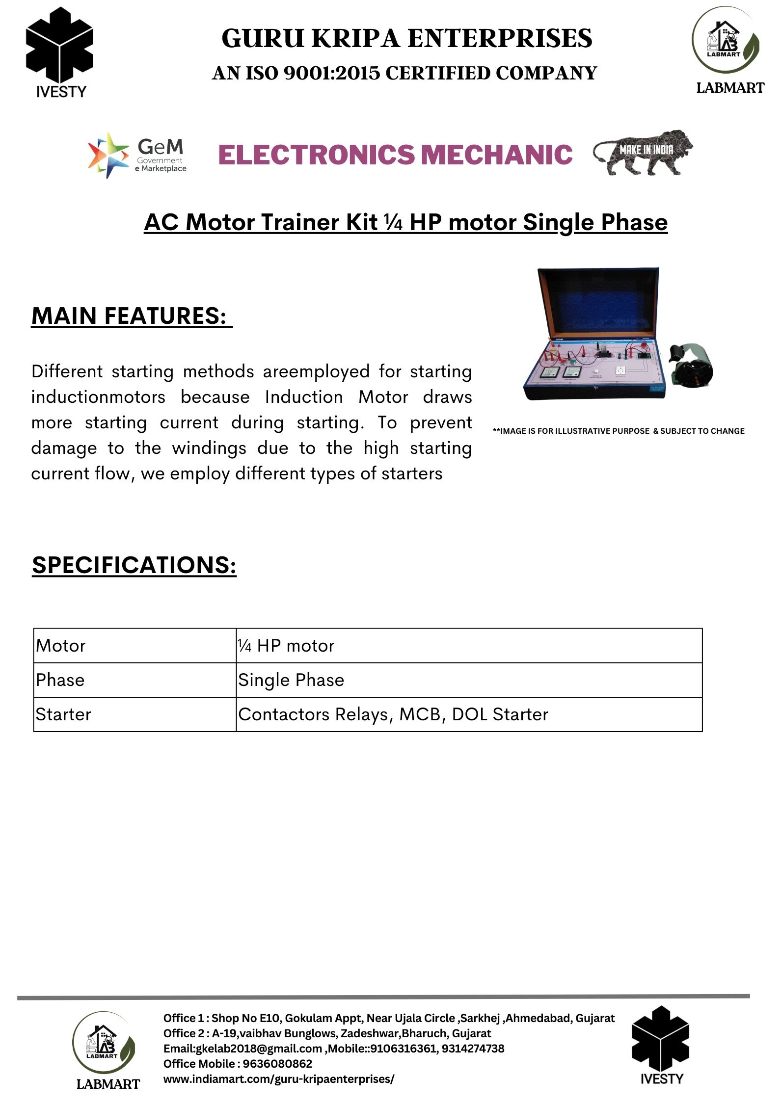 AC Motor Trainer Kit ¼ HP motor Single Phase