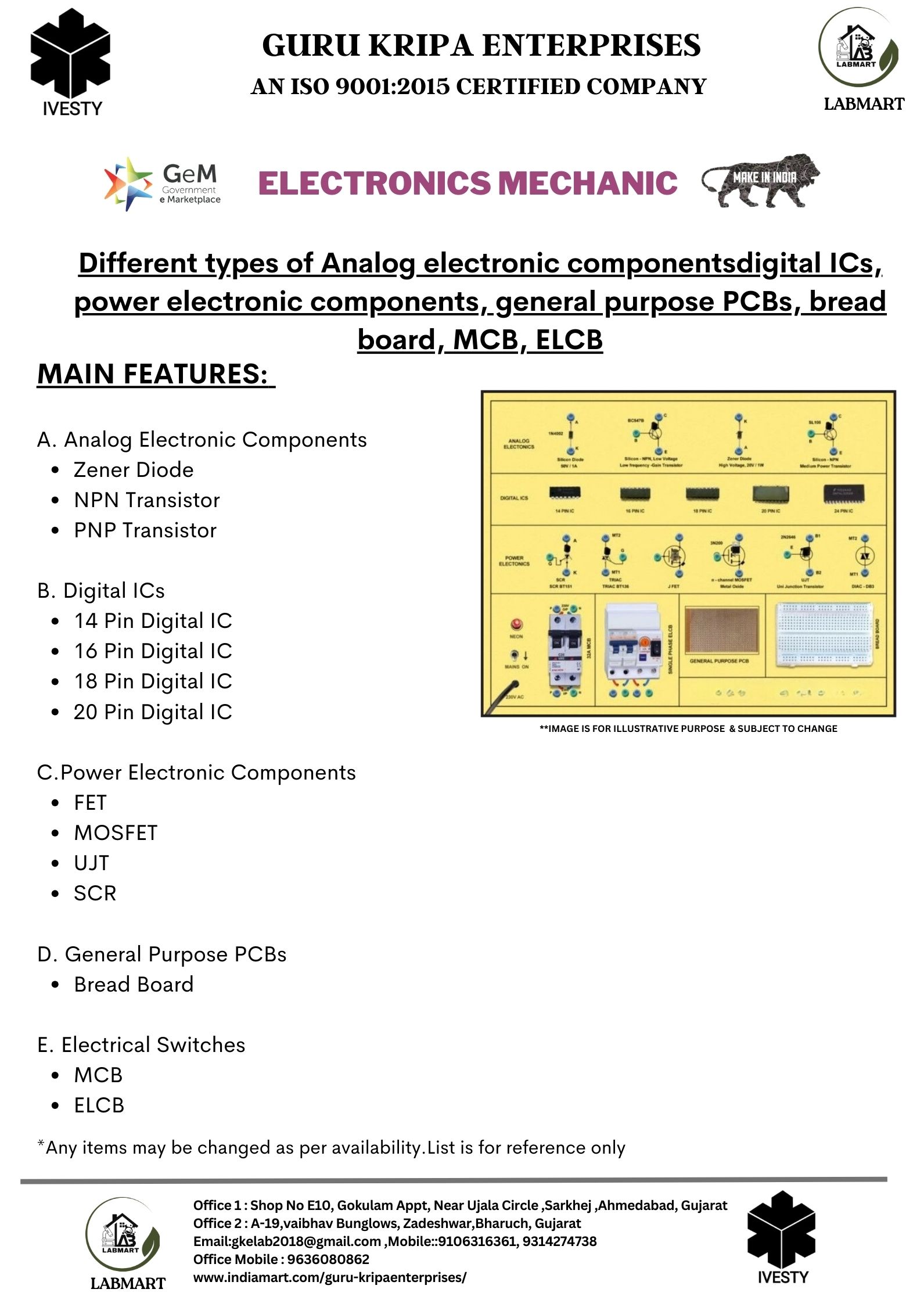 Different types of Analog electronic components digital ICs, power electronic components, general purpose PCBs, bread board, MCB, ELCB