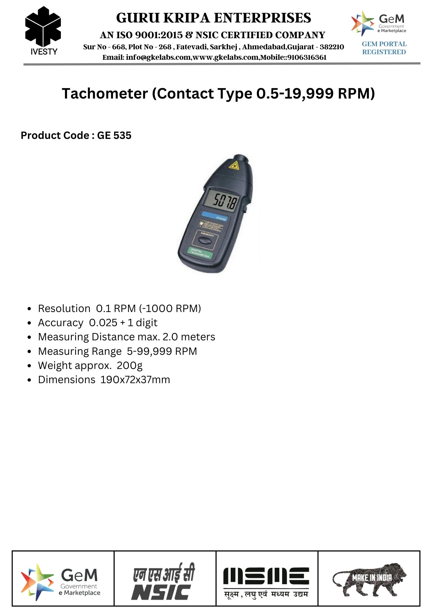 Tachometer (Contact Type 0.5-19,999 RPM)