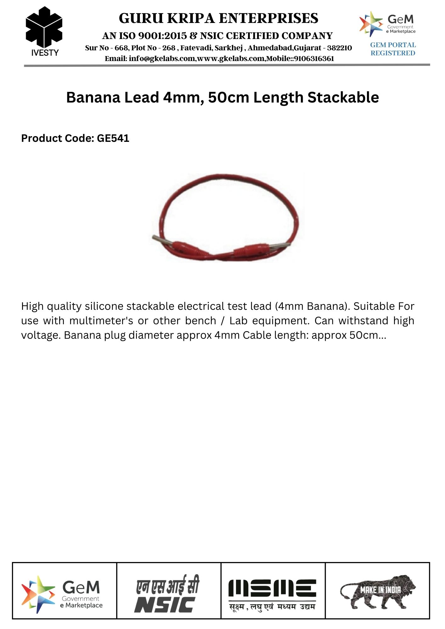 Banana Lead 4mm, 50cm Length Stackable