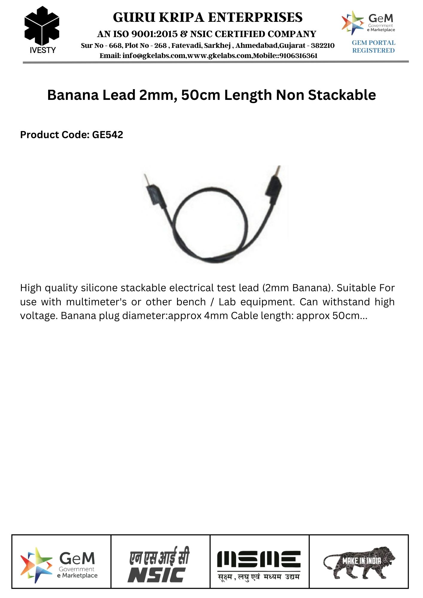 Banana Lead 4mm, 50cm Length Non Stackable